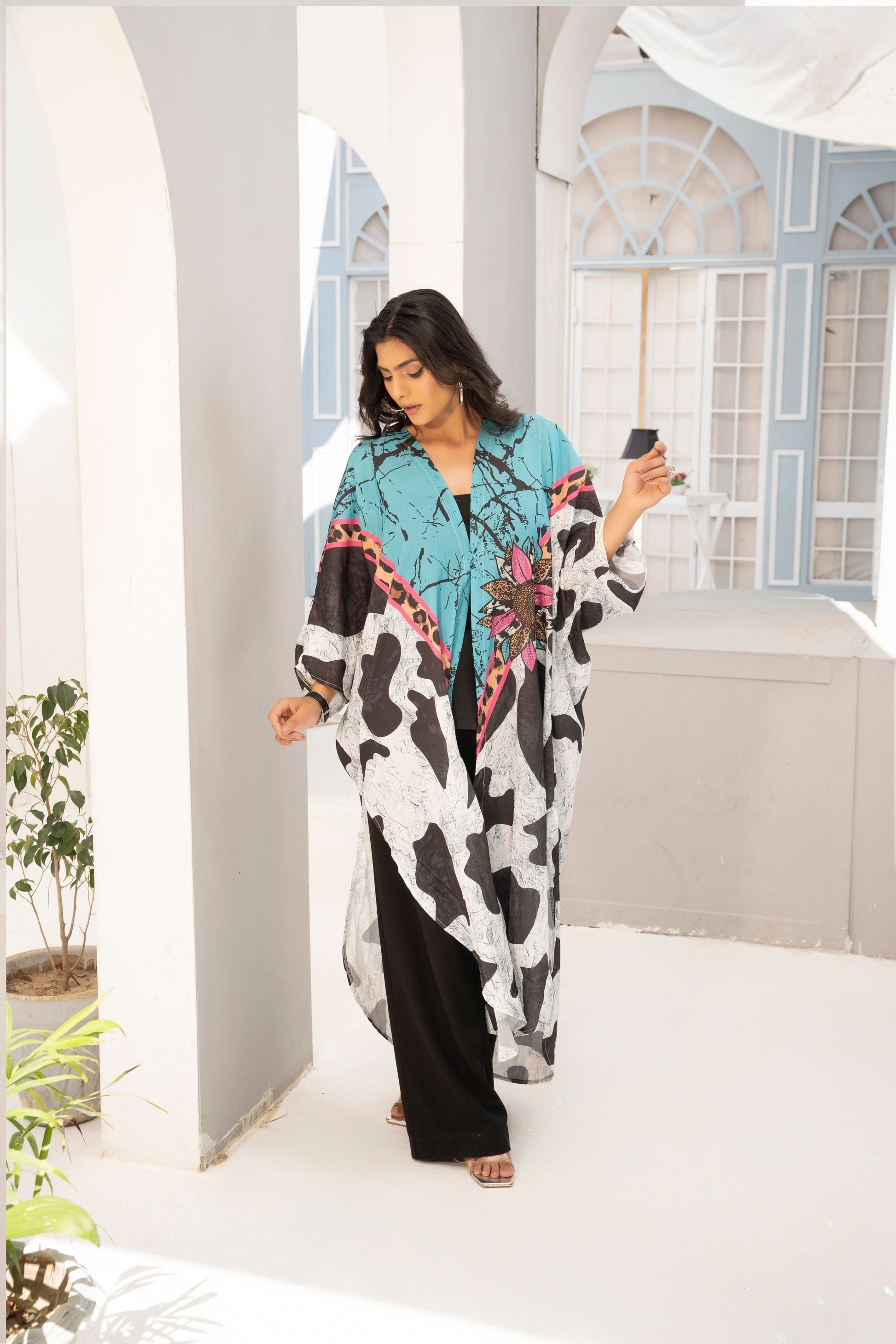 A vibrant printed kaftan with bold patterns, designed for comfort and style. Its loose, flowing silhouette makes it perfect for relaxed, breezy days or beachside outings.